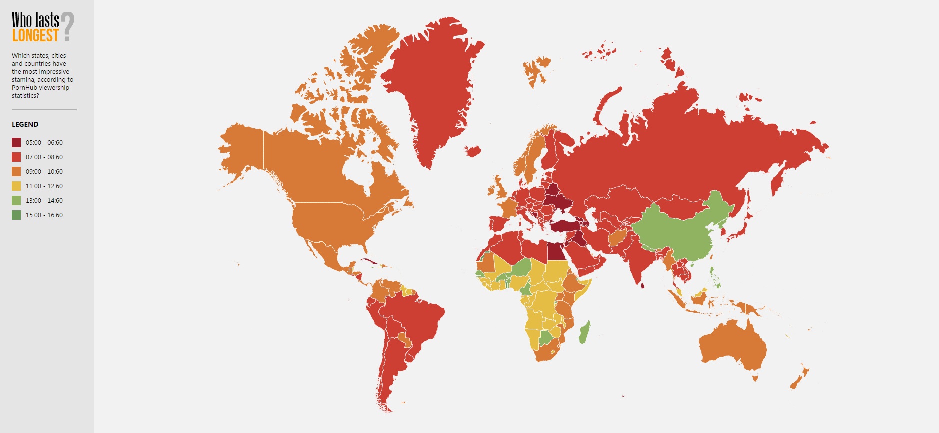 ROMA – I dati certificati con tanto di bollino sono del più importante sito porno del mondo: quando duriamo davanti a un filmato porno? Stato per stato PornHub ha stilato la classifica. A guidare questa speciale classifica ci sono due paesi africani. Prima fra tutti una regione contesa tra il Marocco e il Fronte Polisario: il Sahara occidentale. Gli Sahrawi, così si chiamano gli abitanti del Sahara occidentale, durano 16 minuti e 16 secondi. Con 15 minuti e 3 secondi il Togo si piazza al secondo posto. Sul podio, forse a sorpresa, la Cina con 14 minuti e 34 secondi. Nei primi posti anche Burkina Faso (14:26), Filippine (14:22), Nepal (13:46), Botswana (13:45), Senegal (13:35), Niger (13:15), Benin (13:08), Camerun e Madagascar con 13 minuti netti.
