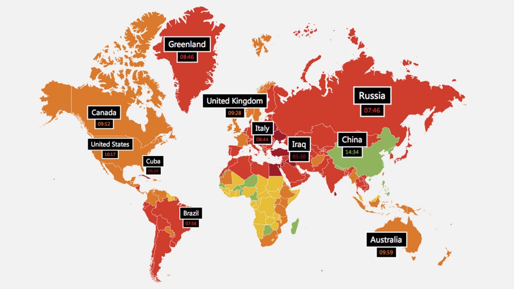 Lontano il Nord America (Stati Uniti a quota 10:17), lontanissimi Europa, Asia e Sud America. E l’Italia? Con 8 minuti e 44 l’Italia in Europa è dietro molti paesi, tra cui la Norvegia (9:30, prima), l’Inghilterra (9:28), la Francia (9:22), la Svezia (9:09) e l’Irlanda (9:08). Tra tutti l’Iraq è il paese più veloce (non certo un vanto nazionale) nel mondo: 5 minuti e 30 secondi. Colpa della connessione?