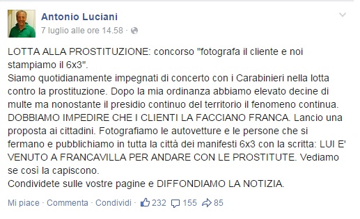 La proposta Luciani l’ha fatta dalla sua pagina Facebook, dove lo scorso 7 luglio ha lanciato un vero e proprio concorso per combattere la prostituzione: