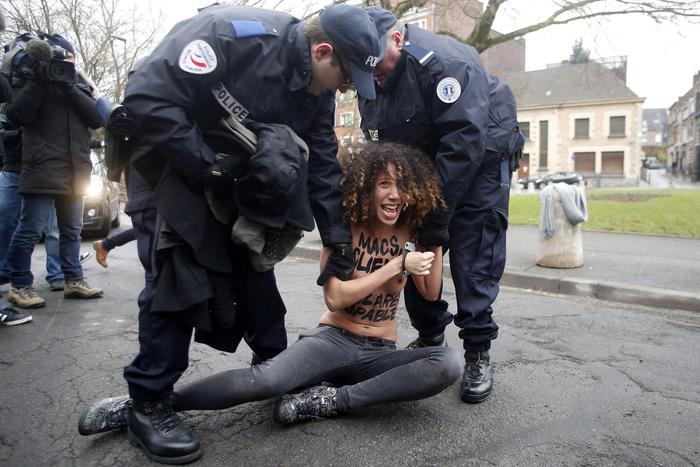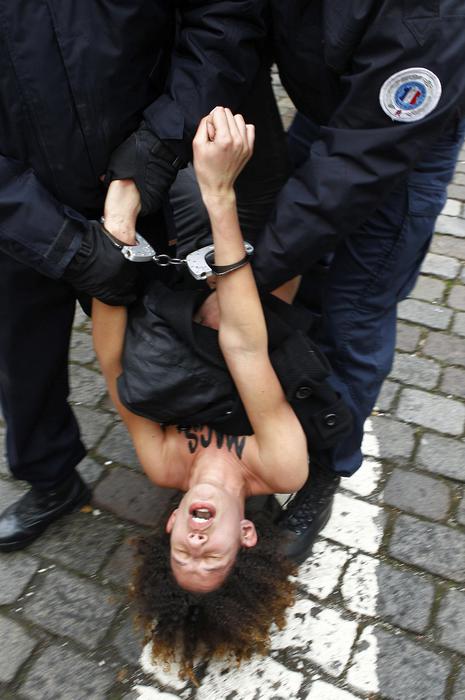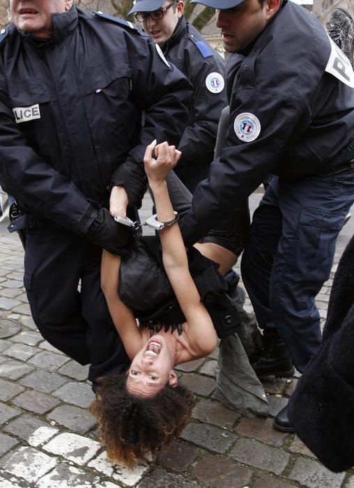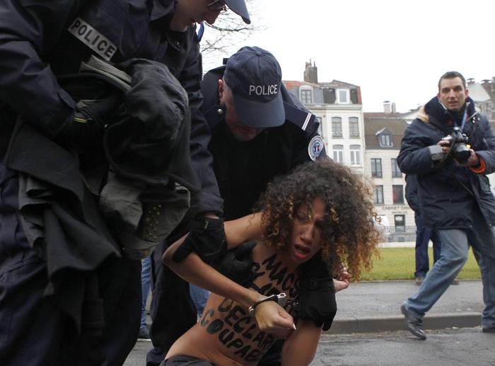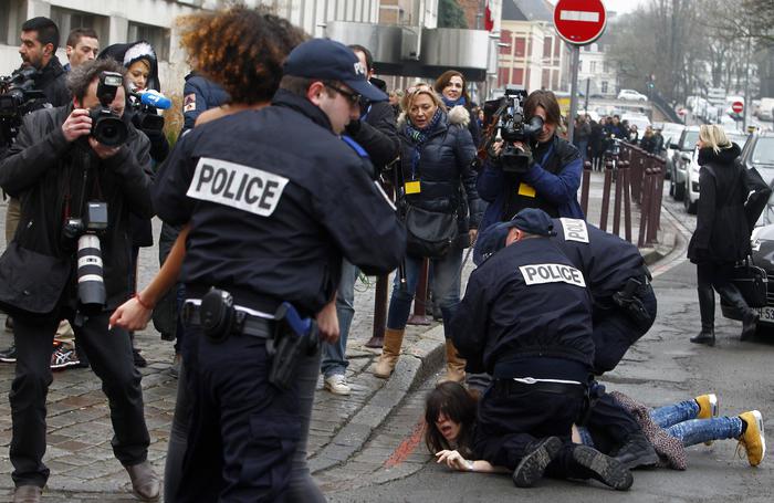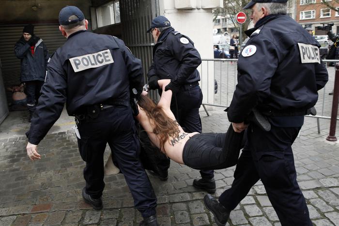 LILLA (FRANCIA) – Tre attiviste del gruppo femminista Femen hanno manifestato a seno nudo davanti al tribunale di Lilla, nel nord della Francia, dove è in corso il processo per sfruttamento della prostituzione a carico dell’ex direttore generale del Fmi Dominique Strauss-Kahn. Le tre donne, a seno nudo e con slogan scritti sul torso, hanno tentato di gettarsi sull’auto in cui viaggiava Strauss-Kahn, al grido di ‘protettori clienti dichiarati colpevoli’.