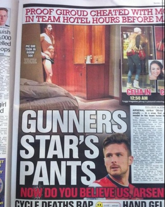 LONDRA – “Giroud (un calciatore dell’Arsenal) “è stato con me, al Four Season, la notte prima della partita” contro il Crystal Palace (poi vinta 2-0). Questa l’accusa di Celia Key, una modella inglese. E ora Giroud, sposato, rischia di veder saltare il matrimonio e la stagione con l’Arsenal. Prima ha provato a negare, poi, perfida, Celia Key ha deciso di diffondere la foto di lui, in mutande, al Four Season.