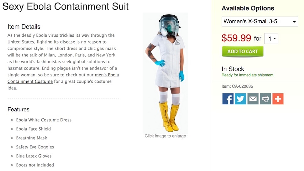 L’annuncio della vendita del vestito è apparso sui siti di compravendita online: il nome del vestito (gli stivali vengono venduti separatamente) dedicato alle donne è “Sexy Ebola Containtment Suite”. Quello del corrispettivo maschile è chiamato semplicemente “Ebola Containment Suit”. Sull’annuncio del costume di Halloween che ha vinto il premio annuale del cattivo gusto si legge: