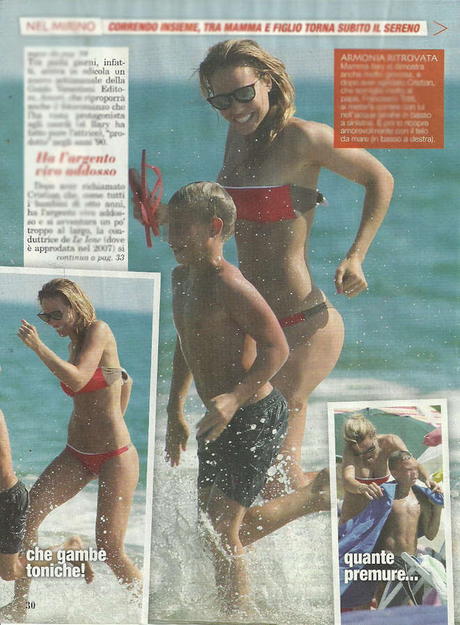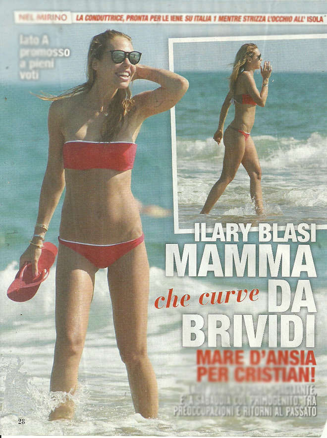 ROMA – Ilary Blasi, conduttrice del fortunato programma televisivo “Le Iene”, ed in lizza per la conduzione della nuova edizione (sui canali Mediaset) dell’Isola dei Famosi, sta trascorrendo qualche giorno di vacanza al mare a Sabaudia col figlio Cristian Totti. Bikini striminzito per esaltare un fisico ed un lato b, senza mezzi termini, da urlo. Ilary Blasi ha trascorso la giornata fra giochi in spiaggia ed un attento controllo della ‘ piccola peste ‘. Assente giustificato Francesco Totti: il calciatore è impegnato nella tournèe pre – campionato dei giallorossi. (Foto delle pagine del giornale ‘TOP’).
