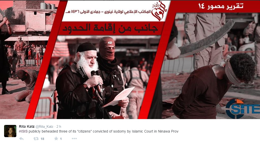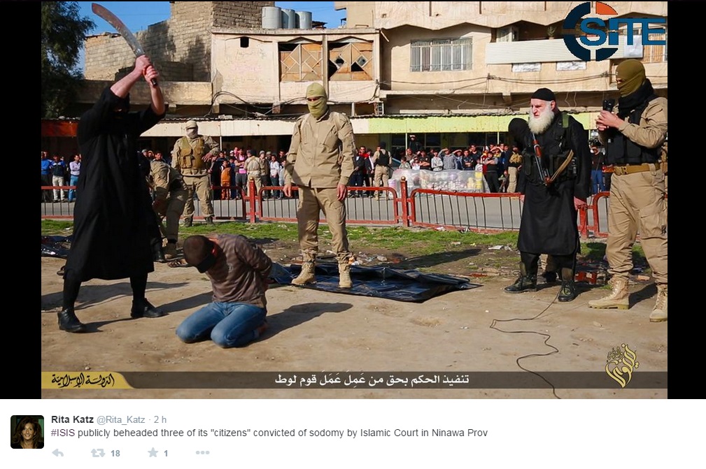 Nel pomeriggio, si era diffusa la notizia che l’Isis avrebbe decapitato tre persone condannate per sodomia da un tribunale islamico nella provincia irachena di Ninawa, vicino a Mosul. Katz ha pubblicato sul social network anche le foto in cui si vedono i condannati bendati e inginocchiati in una piazza gremita di gente, mentre un boia alza una scimitarra pronto a colpire.