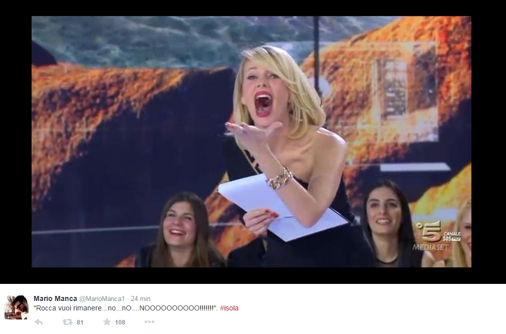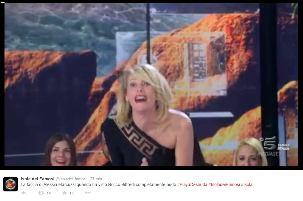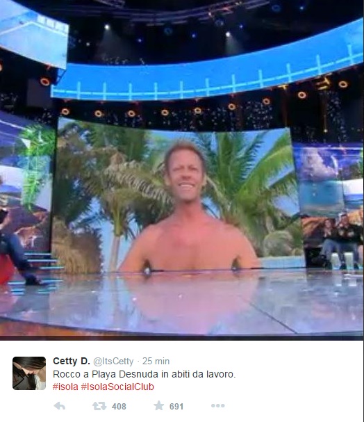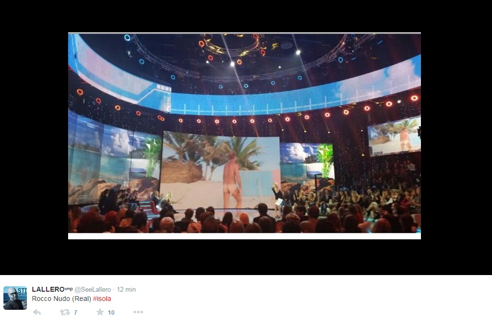 In studio intanto, Alessia Marcuzzi scoppia a ridere e gli chiede di andare dietro al parapetto, altrimenti i cameraman dovranno continuare ad inquadrarlo dal basso verso l’alto. Tutti in studio scoppiano a ridere imbarazzati, Alfonso Signorini e Mara Venier compresi. Su Twitter intanto, impazzano le foto dello show di Rocco.