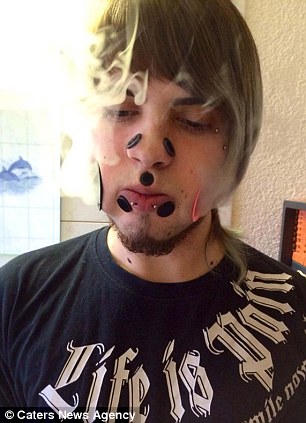“Da allora ha totalizzato 27 piercing, 6 tatuaggi, un impianto e si è addirittura marchiato il sedere spendendo finora 5000 euro – Negli anni ha acquisito sempre più esperienza diventando sempre più estremo arrivando ad avere buchi 36mm per ogni guancia e dice di voler arrivare a 40mm…”