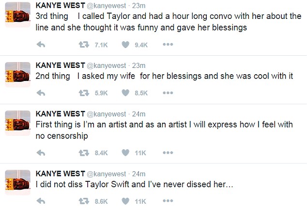 Su Twitter West si è difeso dicendo di aver avuto la benedizione di Taylor ma il portavoce della cantante l’ha smentito Nel frattempo, gli amici di Swift sono venuti a sua difesa sui social media. Il fratello di Taylor Swift, Austin, ha postato su Instagram un video dove getta le scarpe firmate Yeezy in un cestino. Non la prima volta tra i due. Agli Mtv del 2009 West interruppe il discorso di Swift mentre riceveva il premio per il miglior video femminile. Anche recentemente, i due si erano chiariti in pubblico. Alla stretta di mano in pubblico, era presente anche la moglie di lui Kim Kardashian.