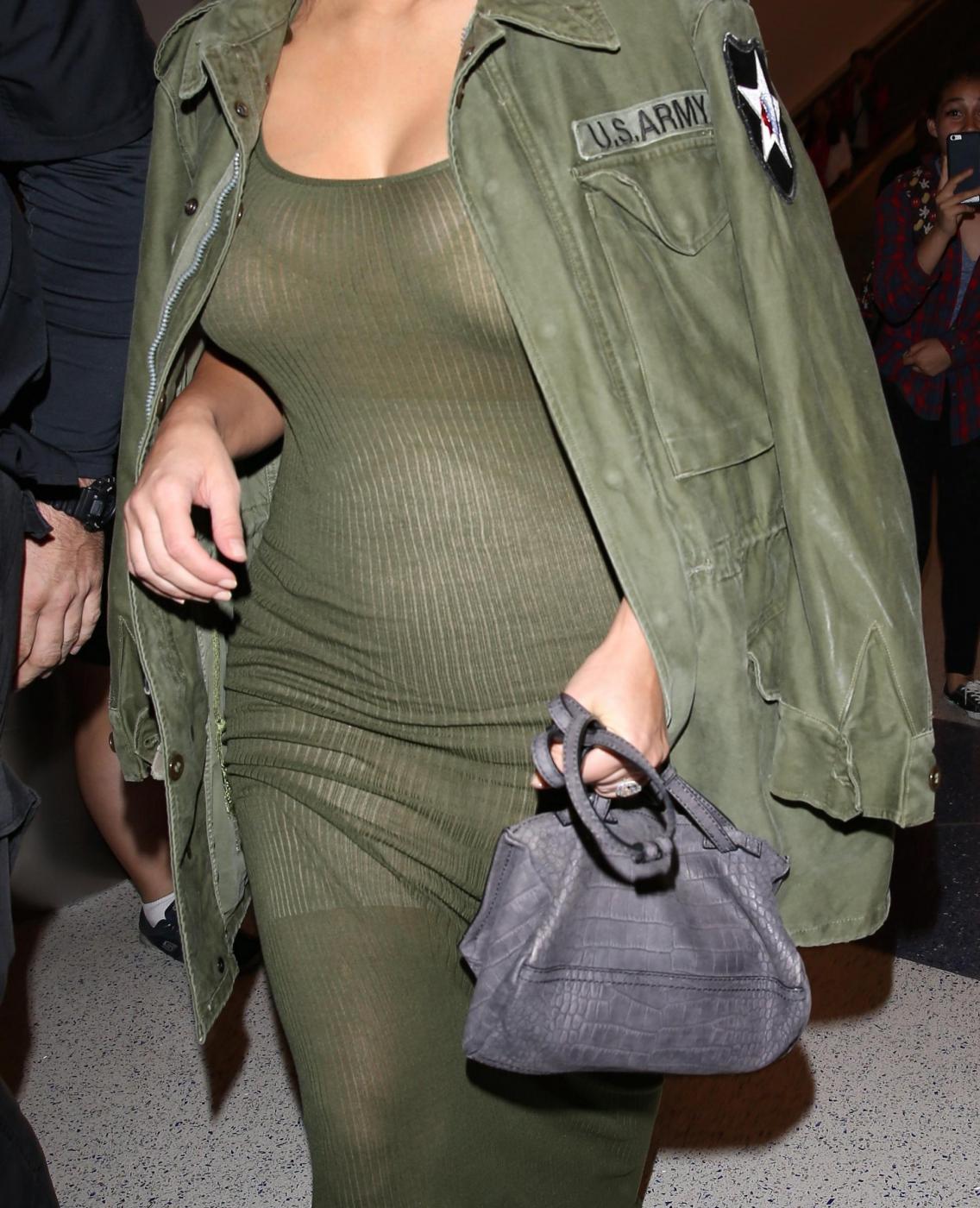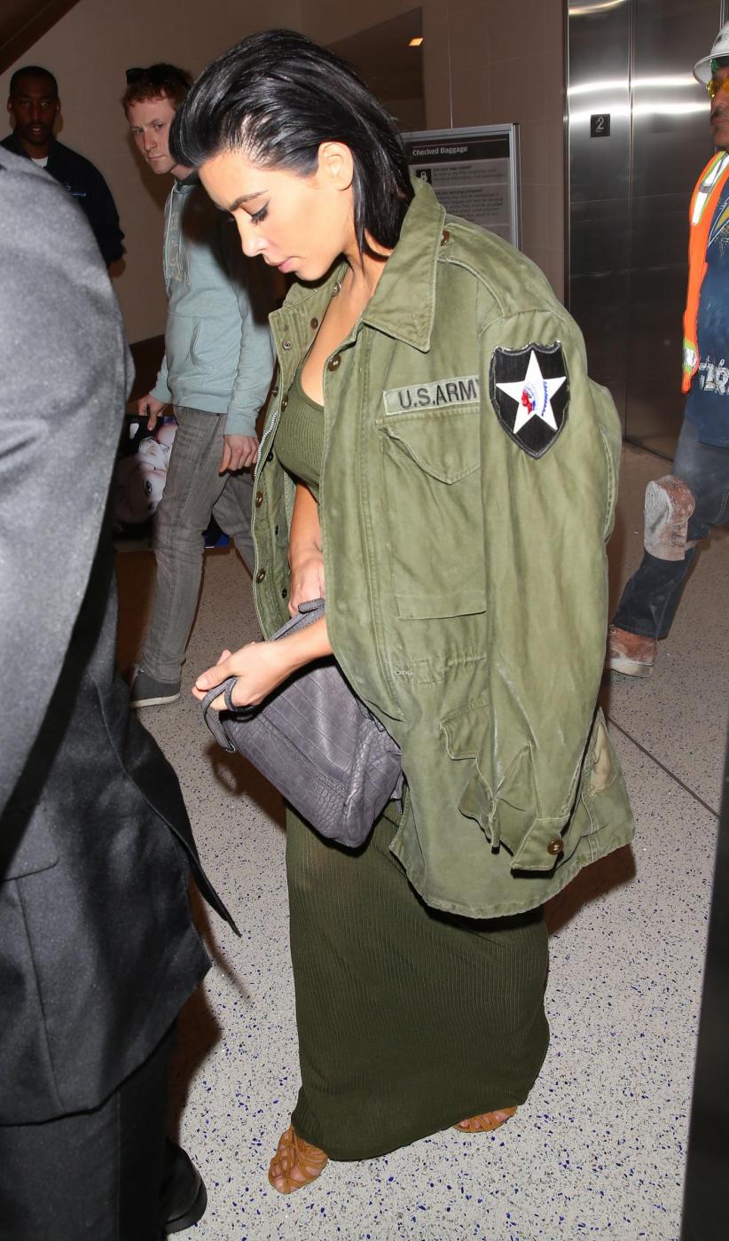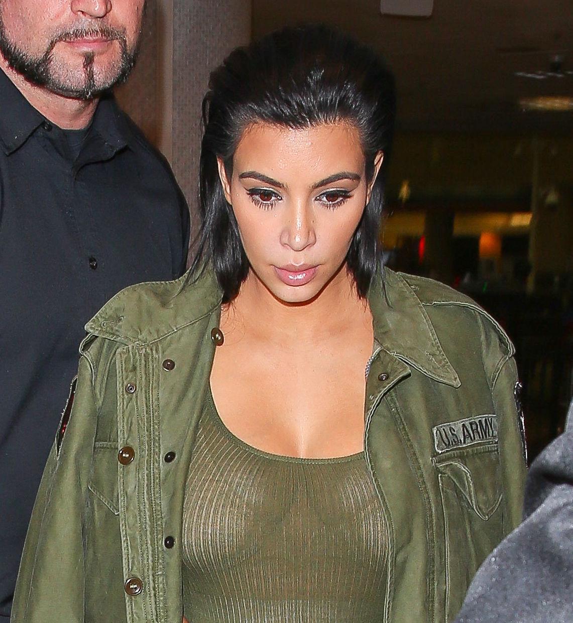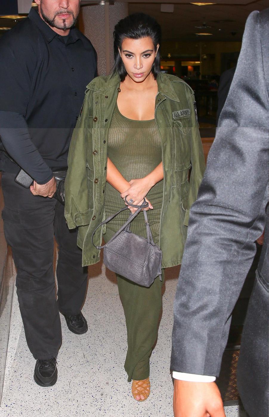 Kim è stata paparazzata in aeroporto a Los Angeles dopo il suo ritorno da Nashville, dove era andata per promuovere un energy drink. La bella Kim per sottrarsi agli scatti insistenti dei fotografi si è coperta con la giacca militare. Ma le trasparenze del vestito hanno comunque lasciato intravedere le sue forme sinuose (foto e video LaPresse).