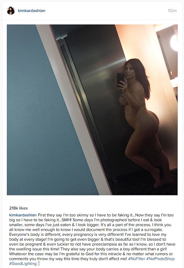 Kim Kardashian continua a regalare ai suoi 42 milioni di fan su Instagram foto in cui posa nuda. Questa volta si tratta di un selfie che mostra il suo corpo per intero, con il pancione in bella vista e le mani che coprono i seni.