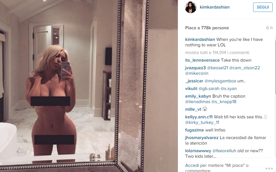 LOS ANGELES – “Quando non hai niente da metterti” cinguetta su Instagram tutta nuda davanti allo specchio Kim Kardashian. Niente slip e reggiseno, ma al loro posto due strisce nere, una sorta di censura che la Kardashian ha fatto per la Rete. Kim è riuscita a perdere una ventina di chili dopo la seconda gravidanza e ora sfoggia le curve nei selfie.