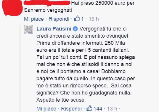 Ma non è finita qui. Continuando a scorrere la lista dei commenti ecco che spunta anche l’ennesima accusa di un fan sui presunti compensi da capogiro che la cantante avrebbe percepito a Sanremo 2016. Con lo stesso piglio Laura Pausini lo rimette al suo posto: