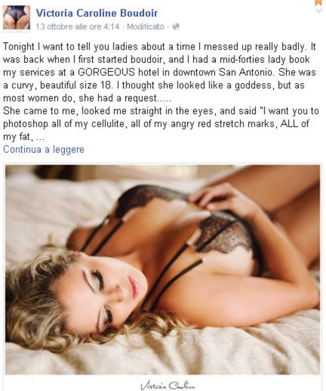 la storia l’ha raccontata la fotografa stessa su Facewbook. Siamo a San Antonio in Texas: la fotografa si chiama Victoria Caroline ed è specializzata in immagini di donne che posano così: “Tutto è iniziato quando una donna sui 45 anni ha prenotato una servizio in un hotel nel centro; era morbida e sinuosa pensai che sembrava una dea ma, come la maggior parte delle donne, aveva una richiesta molto precisa”. “Venne da me – continua la fotografa – mi guardò dritto negli occhi e disse ‘vorrei che tu photoshoppassi tutta la mia cellulite, le mie smagliature, il mio grasso e tutte le mie rughe… voglio sentirmi stupenda almeno una volta’. E così ho fatto”.