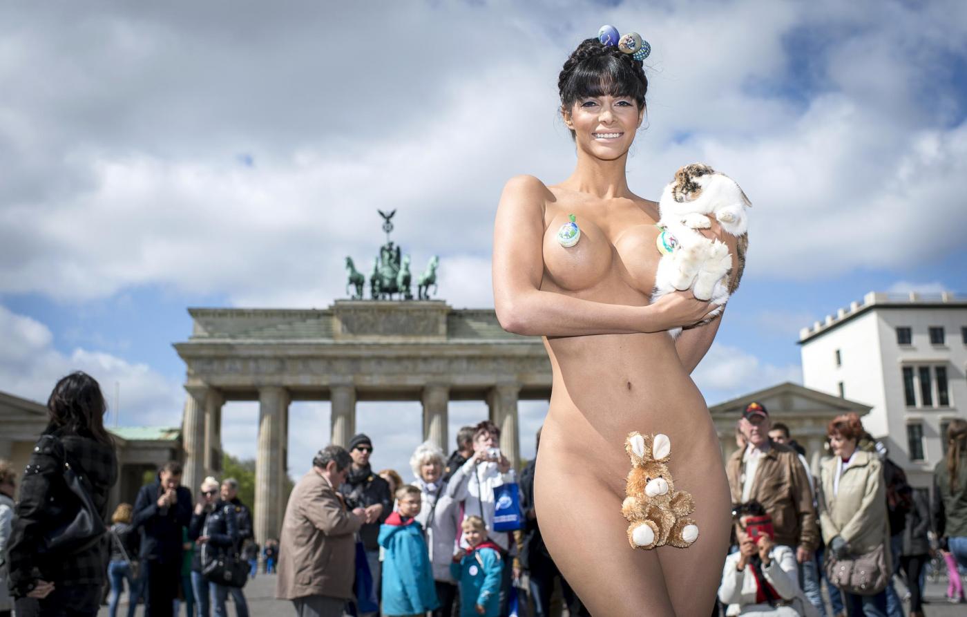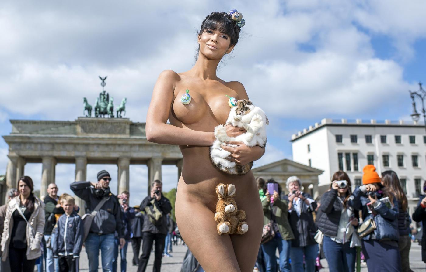 BERLINO – La modella tedesca Micaela Schaefer, in occasione di ogni festa che si rispetti si fa trovare pronta a posare quasi senza veli davanti alla porta di Brandeburgo di Berlino.