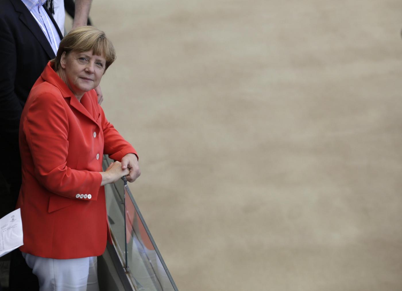 Ma, mentre la cancelliera aveva pantaloni bianchi e giacca rossa, la Schaefer ha scelto un abbigliamento più “minimal”, optando solo per la giacca, perdipiù aperta, cosicchĆ© le “grazie” della bella tedesca non fossero coperte.