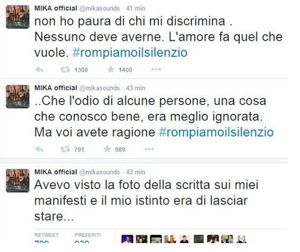 FIRENZE – “Avete ragione #RompiamoIlSilenzio“. Così il cantante Mika ha raccolto l’invito solidale dei fan e ha postato sulla sua pagina Instagram la foto di una scritta omofoba apparsa su un poster che pubblicizzava il concerto che terrà a Firenze il prossimo 30 settembre.