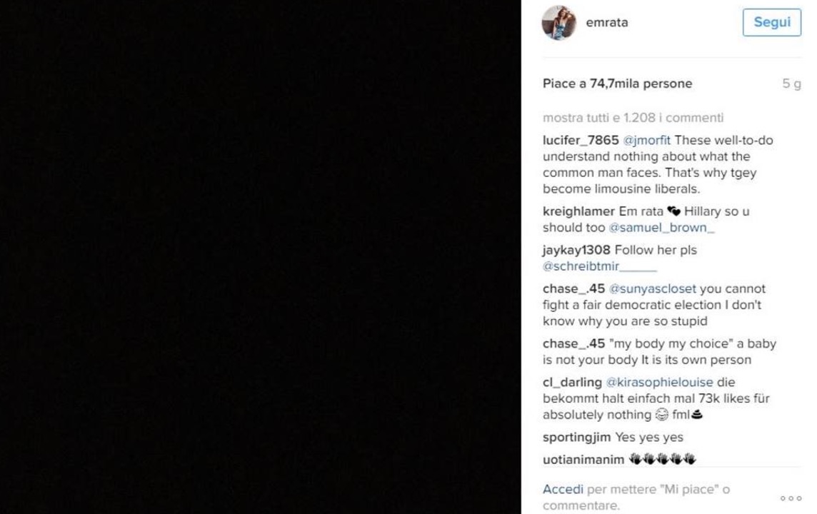 In campagna elettorale la modella si era schierata con Hillary Clinton, come gran parte del mondo dello spettacolo, e all’indomani della vittoria di Trump aveva pubblicato l’immagine di uno schermo nero. Poi il topless contro quella che è stata ribattezzata “cultura dello stupro” soprattutto in seguito al video in cui Donald Trump raccontava senza remore di desiderare tutte le donne belle che vedeva e di non fermarsi di fronte a nulla: “Quando sei famoso puoi fare di tutto”.