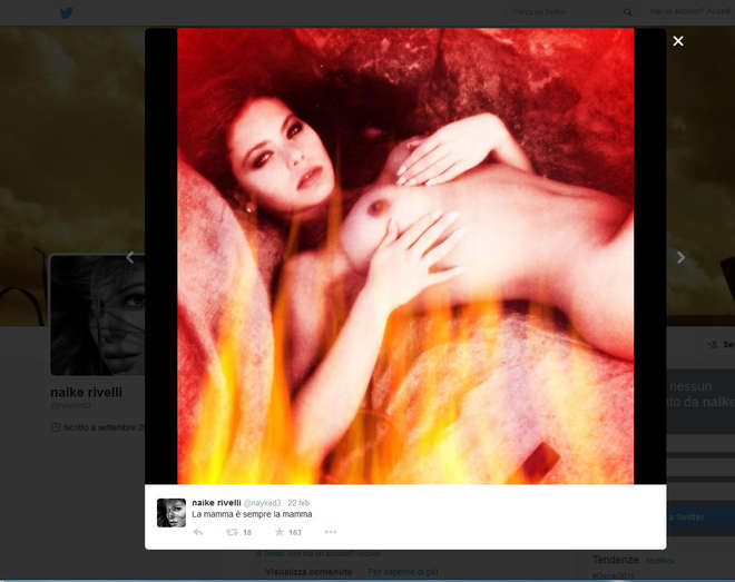 ROMA – Naike Rivelli posta una foto su Twitter che la ritrae completamente nuda e scrive un messaggio che inneggia all’autoerotismo. La figlia di Ornella Muti ha postato sul social network una foto davvero trasgressiva, che lascia ben poco spazio all’immaginazione. “La classe non è acqua, una espressione che comincia ad avere un senso. Mi consolo da sola”, cinguetta Naike su Twitter.