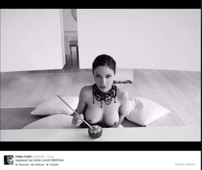 ROMA – Naike Rivelli torna a pubblicare foto senza veli su Twitter. Dopo le foto mentre fa yoga in topless su Instagram e quelle in cui posa nuda per presentare il video del singolo Defaillance, la figlia dell’attrice Ornella Muti ha posato per un servizio fotografico in casa dall’ispirazione giapponese.