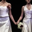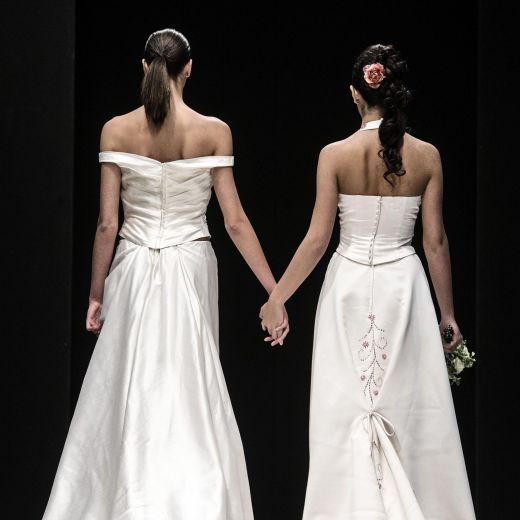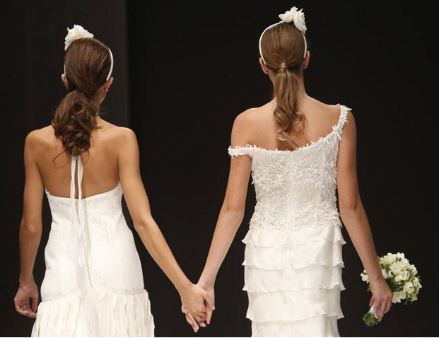 ROMA – Due modelle in abito bianco sfilano mano nella mano. Poco dopo calcano la stessa passerella, due modelli, anche loro in eleganti completi da matrimonio. E’ la prima sfilata di abiti per nozze gay presentata in occasione di ForWedding 2014, la fiera per il matrimonio in programma da giovedì a domenica alla Nuova Fiera di Roma. Eloquente il titolo dato alla passerella: The Rainbow Wedding Fasion Show.