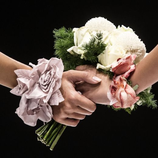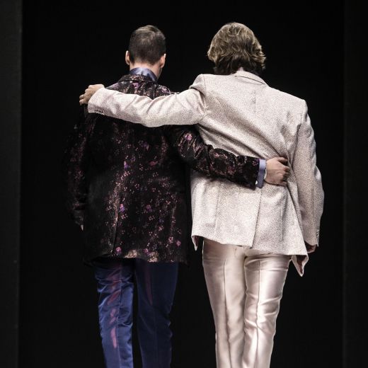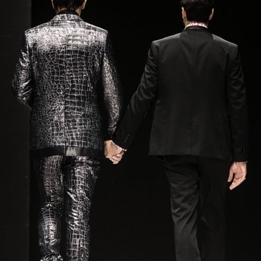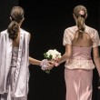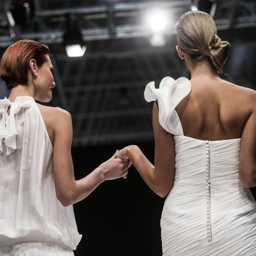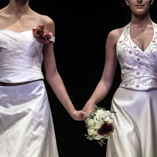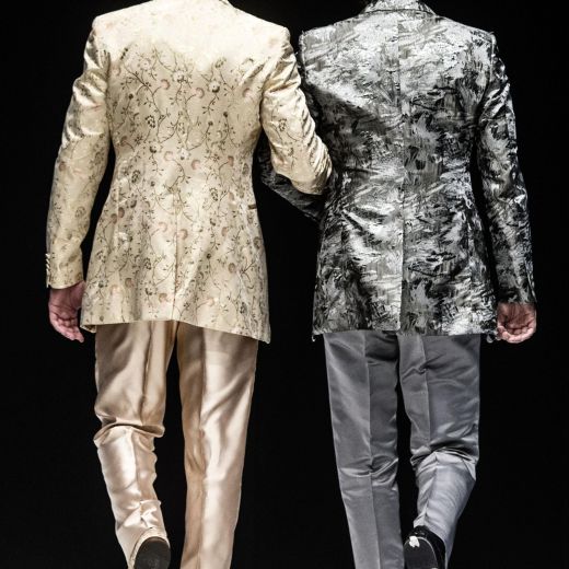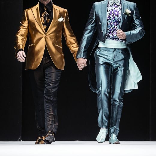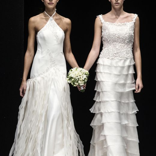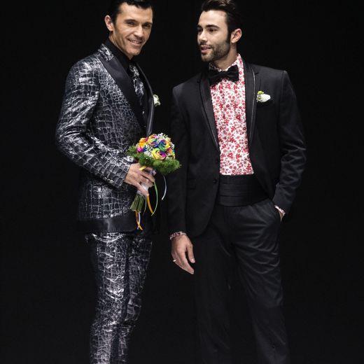 In pedana si sono avvicendate 20 coppie gay, 40 capi in tutto realizzati dalla maison Celli, che nello storico atelier dei Castelli produce circa 2mila abiti da sposa l’anno. Ci sono smoking azzurri per le coppie femminili oppure classici abiti bianchi e gonne a campana. Mentre per i boys ci sono giacche in lurex argento o damascate e completi bianchi. Per tutti bouquet di fiori colorati che ricordano il tema “arcobaleno”.