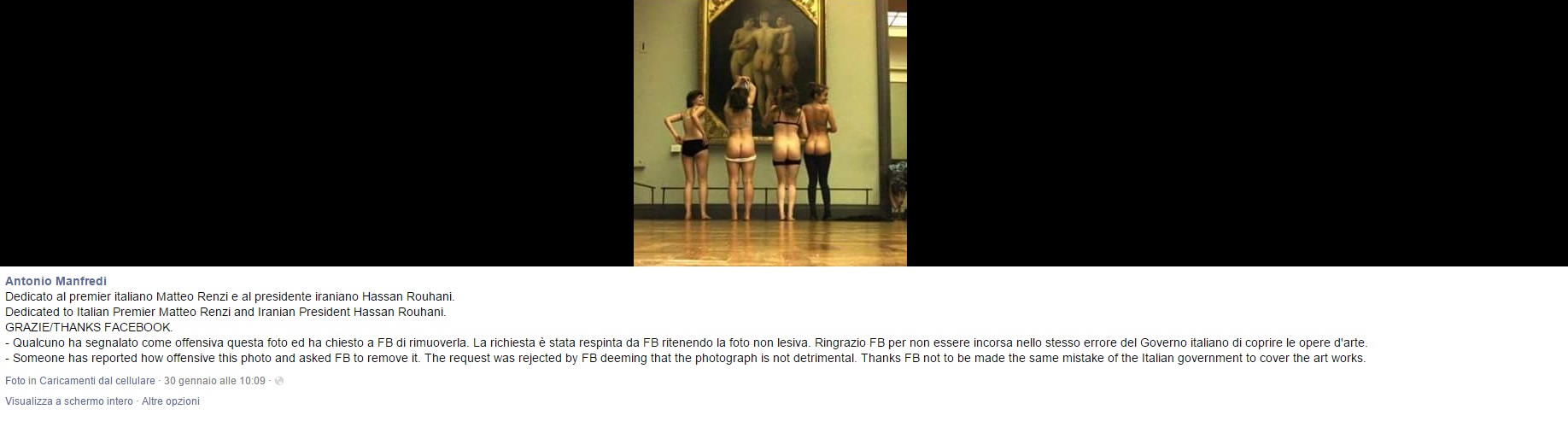 “Qualcuno ha segnalato come offensiva questa foto ed ha choesto a FB di rimuoverla. La richiesta è stata respinta da FB ritenendo la foto non lesiva. Ringrazio FB per non essere incorsa nello stesso errore del Governo Italiano di coprire le opere d’arte”.
