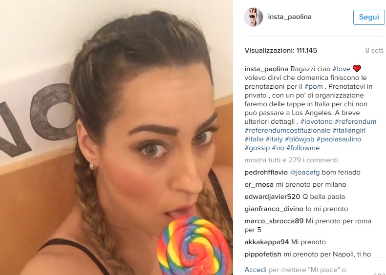 ROMA – Dopo aver terminato il suo “Pompa Tour”, Paola Saulino fa un bilancio dell’evento in giro per l’Italia nato come promessa di praticare sesso orale a tutti quelli che avessero votato No allo scorso referendum. L’attrice napoletana, che vive a Roma, ha così cominciato a girare l’Italia per soddisfare chiunque si fosse presentato. Mesi e mesi di tour, adesso finiti, ma secondo la Saulino, si sarebbe potuto fare di più. In un’intervista al Daily Star, l’attrice spiega infatti: “Ho fatto circa 700 pomp… in tutto ma si poteva fare molto di più se ci fosse stata un’organizzazione più precisa”.