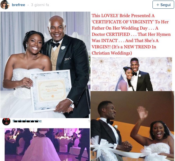 BALTIMORA – “Arriverò vergine al matrimonio“. E’ la promessa che una figlia ha fatto al padre quando aveva solo 13 anni. E Brelyn Bowman non solo ha saputo onorarla, arrivando all’altare ancora casta e illibata, ma ha voluto anche provarlo. Come? Mostrando a tutti gli invitati un certificato medico che attestava la sua purezza.
