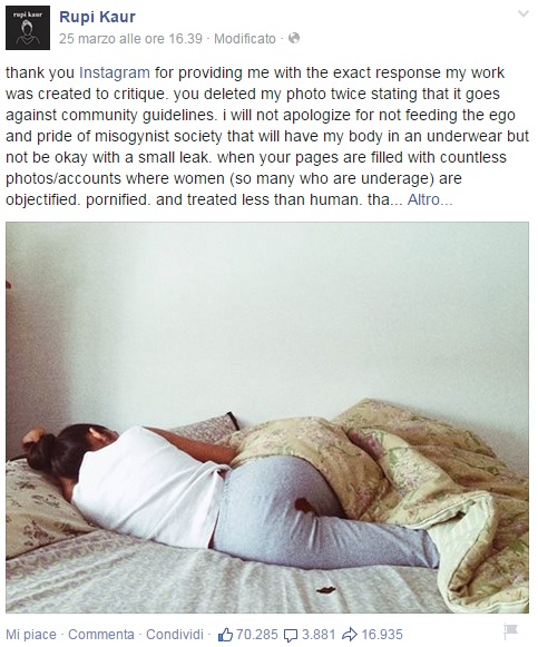 Kaur ha voluto mostrare l’essenza dell’essere donna con questo scatto privo di ogni riferimento pornografico, che mostra soltanto una donna con le mestruazioni. Il soggetto nella foto ha sporcato i pantaloni e il lenzuolo, cosa normalissima e naturale che accade a tutte le donne. La foto ha evidentemente turbato gli animi sul social e Rupi ha voluto replicare alla cancellazione, da lei vissuta come censura: “Mi ci sono voluti quasi 18 anni, ma ora voglio dirlo: ho le mestruazioni”.