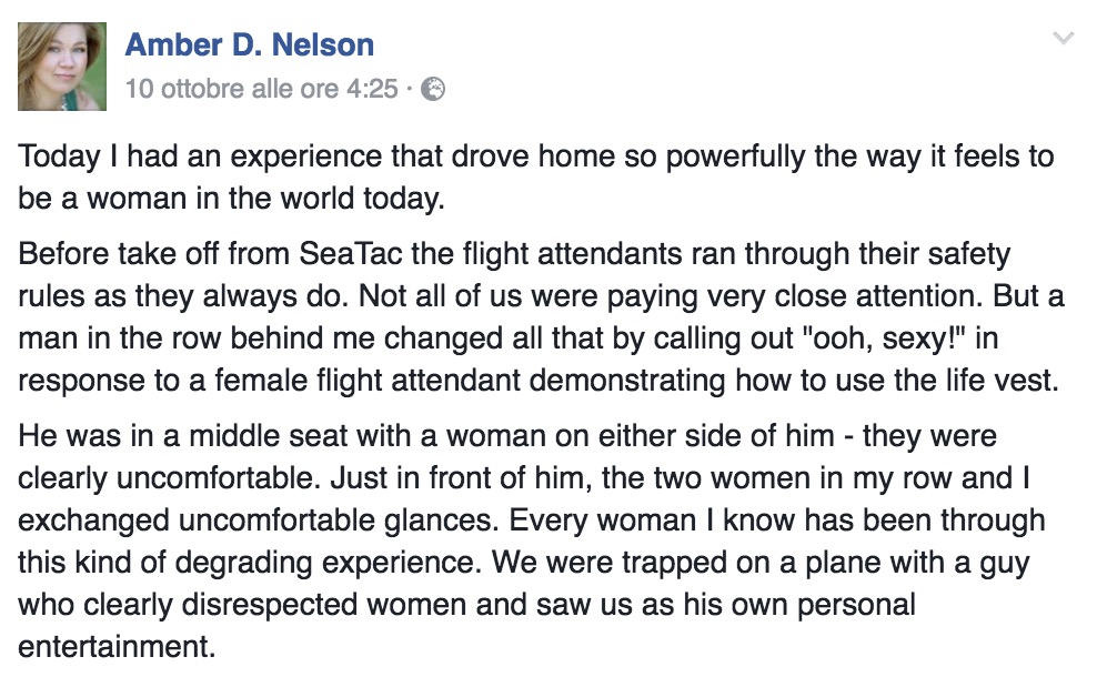 Il post è stato pubblicato il 9 ottobre scorso. Da allora ha ricevuto 17mila like ed è stato condiviso quasi 4mila volte. E se qualcuno ha commentato come eccessiva la reazione della Alaska Airlines, molti, anche sui quotidiani anglosassoni, bollano quella frase come “molestia sessuale”. In un Paese in cui, con Trump che avanza, le molestie sessuali sono diventate ormai un tema quotidiano.