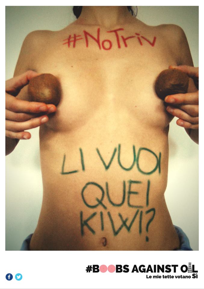 Su Facebook , la “campagna elettorale” è già partita e centinaia di persone hanno condiviso in pochi giorni la pagina “Boobs against oil: le mie tette votano sì” in cui appaiono decine di foto di ragazze senza reggiseno che scrivono messaggi a favore del sì sul seno o sulla pelle nuda.