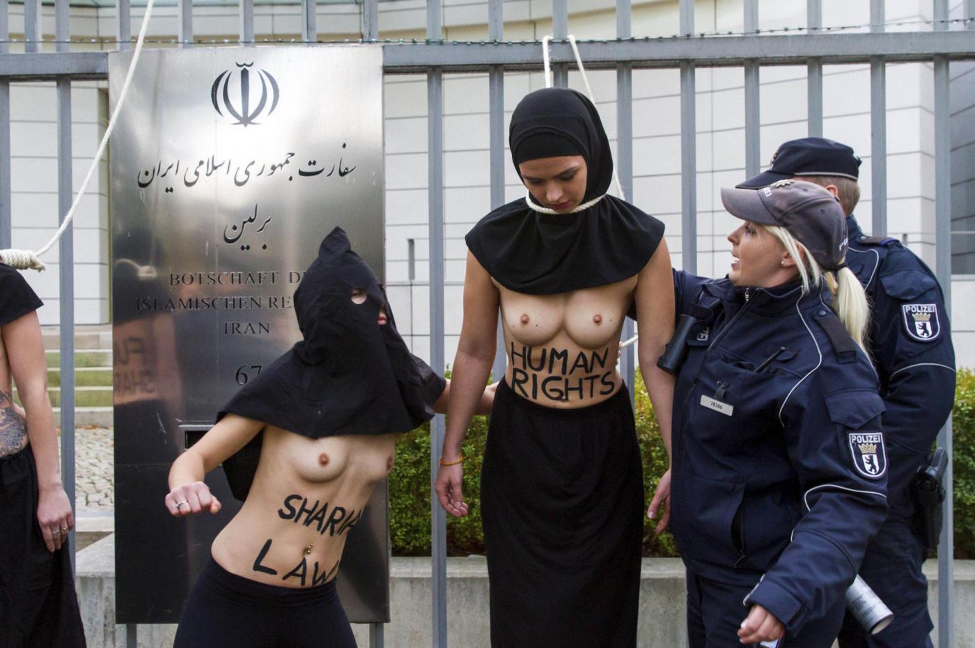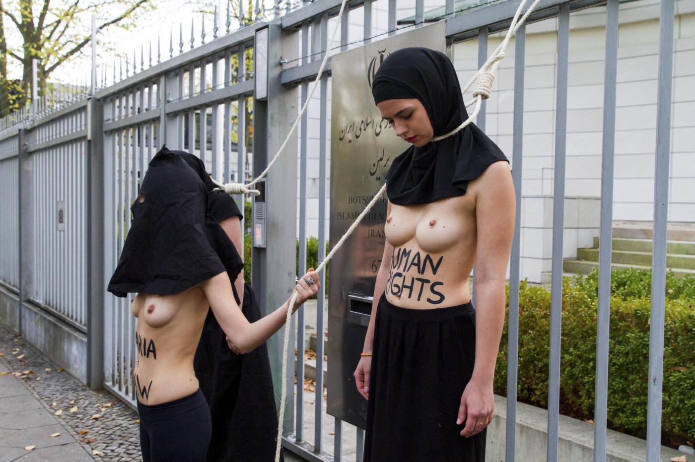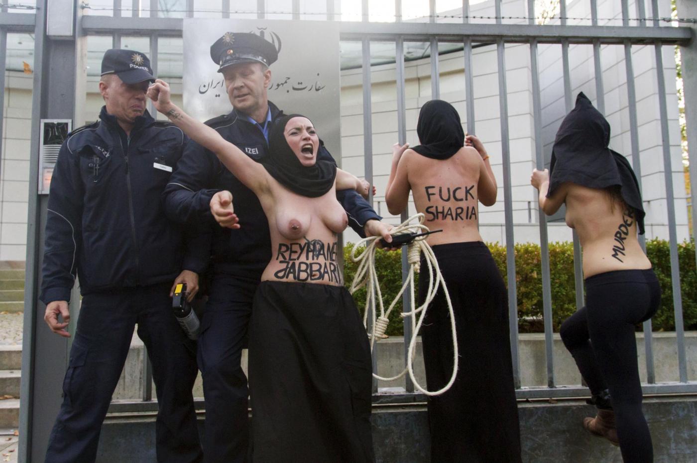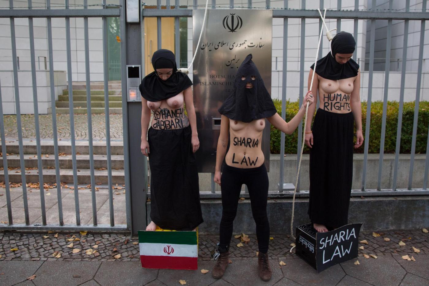 BERLINO – Alcune femministe appartenenti al gruppo delle Femen hanno protestato a seno nudo davanti all’ambasciata dell’Iran di Berlino subito dopo l’uccisione dell’iraniana Reyahneh Jabbari, morta attraverso l’impiccagione perché accusata di aver ucciso l’uomo che l’aveva stuprata.