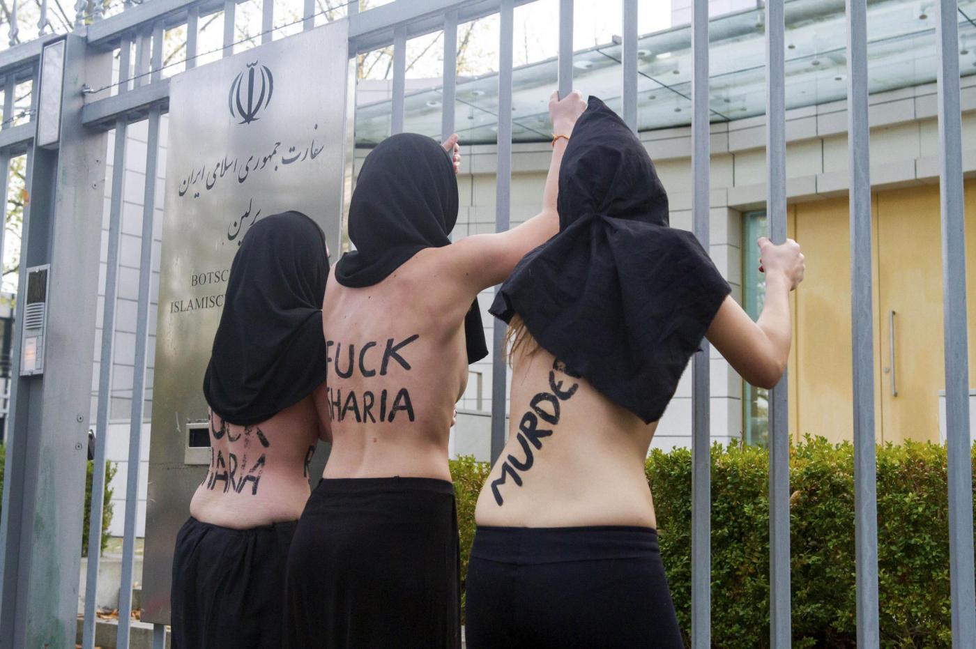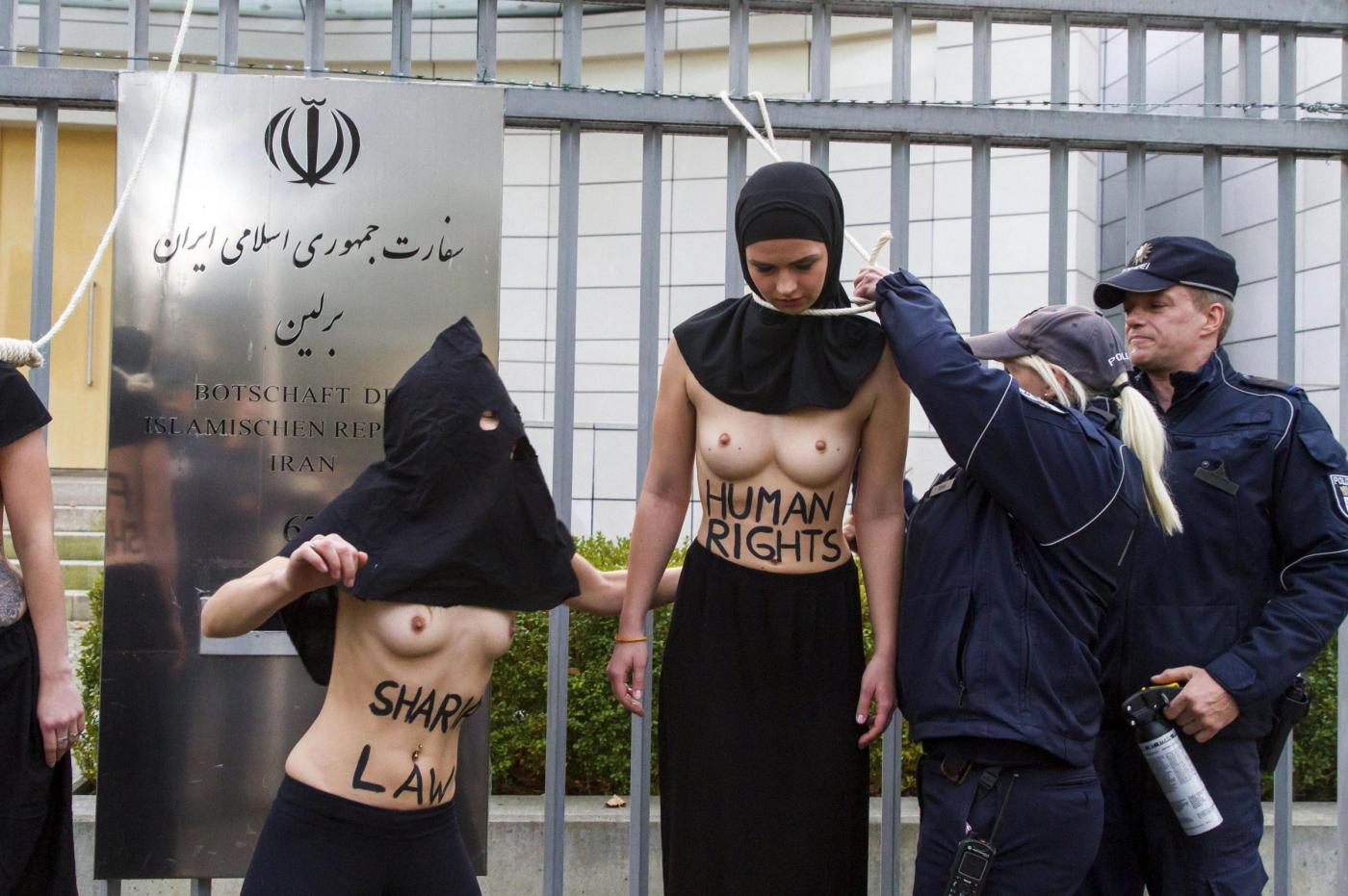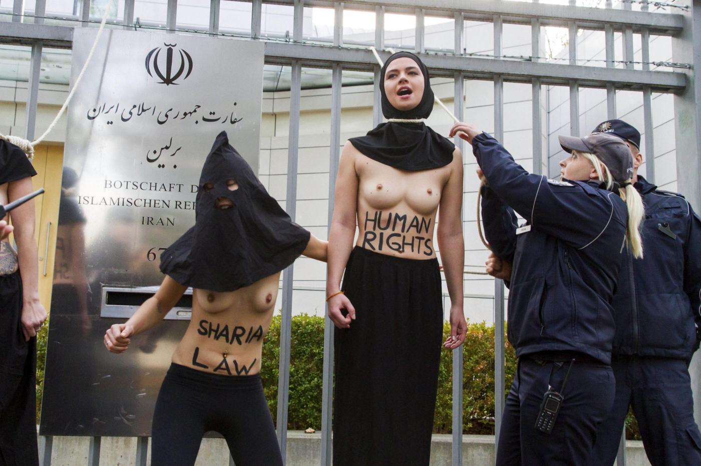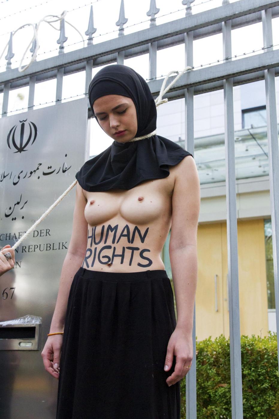 BERLINO – Alcune femministe appartenenti al gruppo delle Femen hanno protestato a seno nudo davanti all’ambasciata dell’Iran di Berlino subito dopo l’uccisione dell’iraniana Reyahneh Jabbari, morta attraverso l’impiccagione perché accusata di aver ucciso l’uomo che l’aveva stuprata.