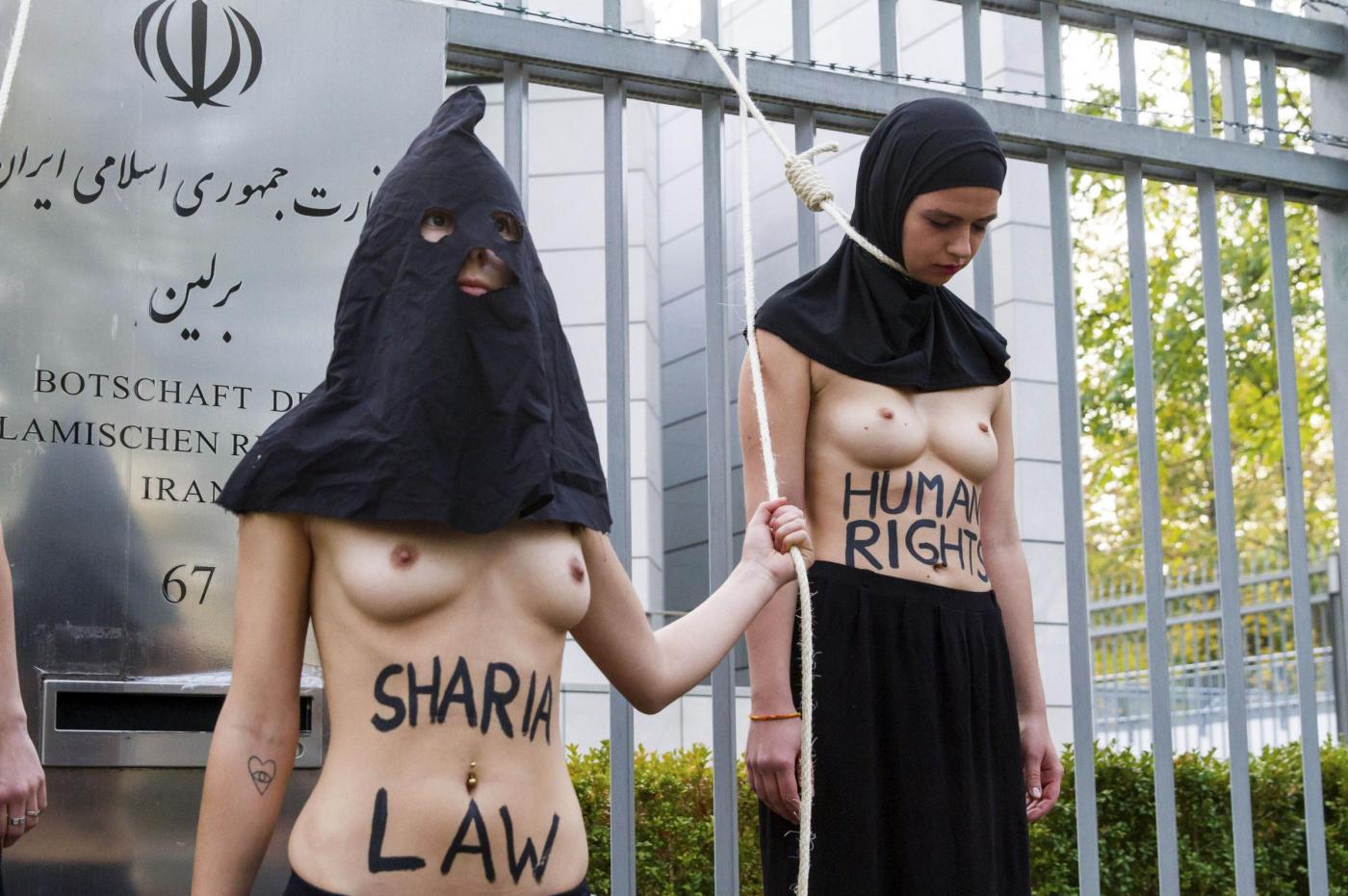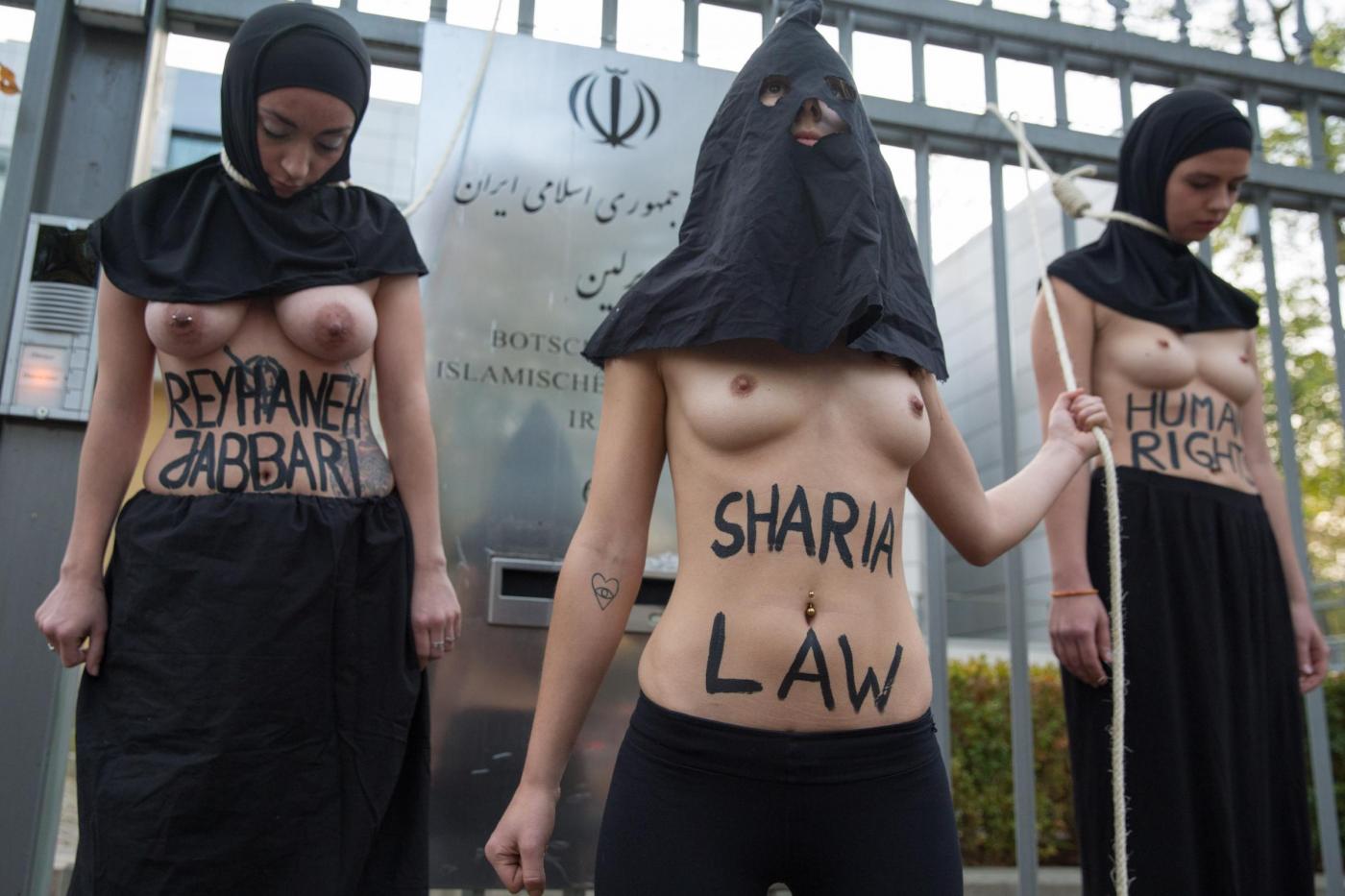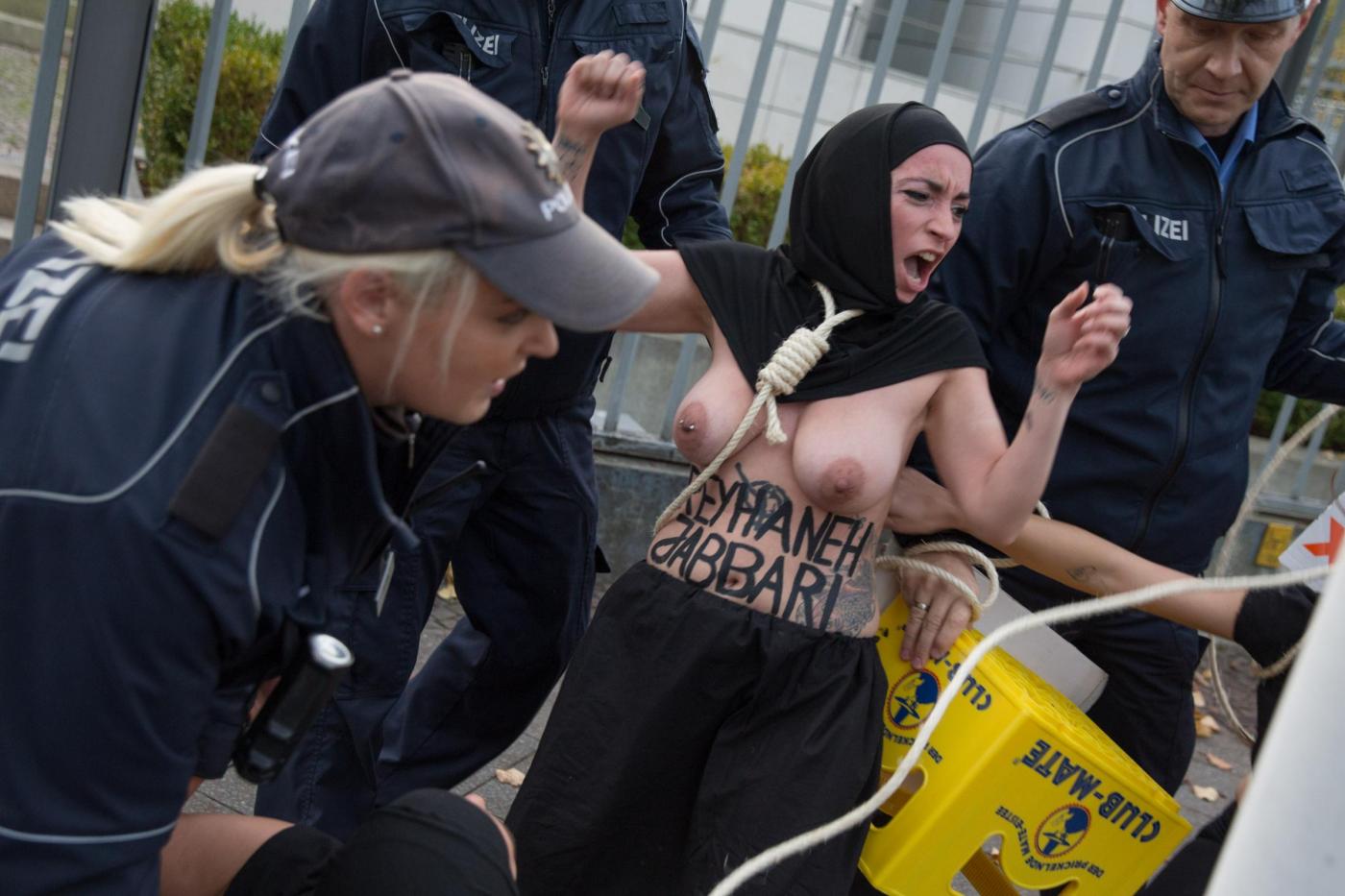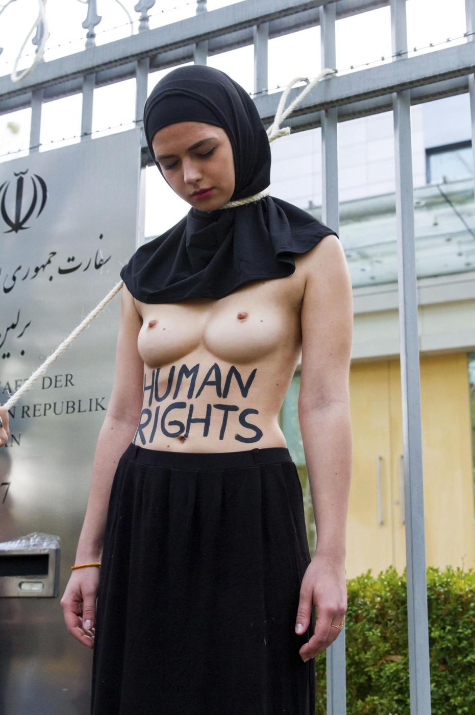 BERLINO – Alcune femministe appartenenti al gruppo delle Femen hanno protestato a seno nudo davanti all’ambasciata dell’Iran di Berlino subito dopo l’uccisione dell’iraniana Reyahneh Jabbari, morta attraverso l’impiccagione perché accusata di aver ucciso l’uomo che l’aveva stuprata.