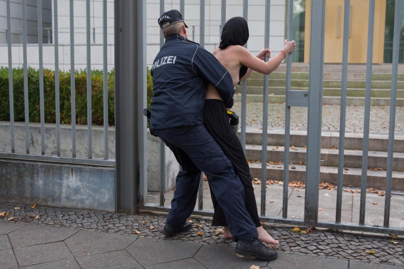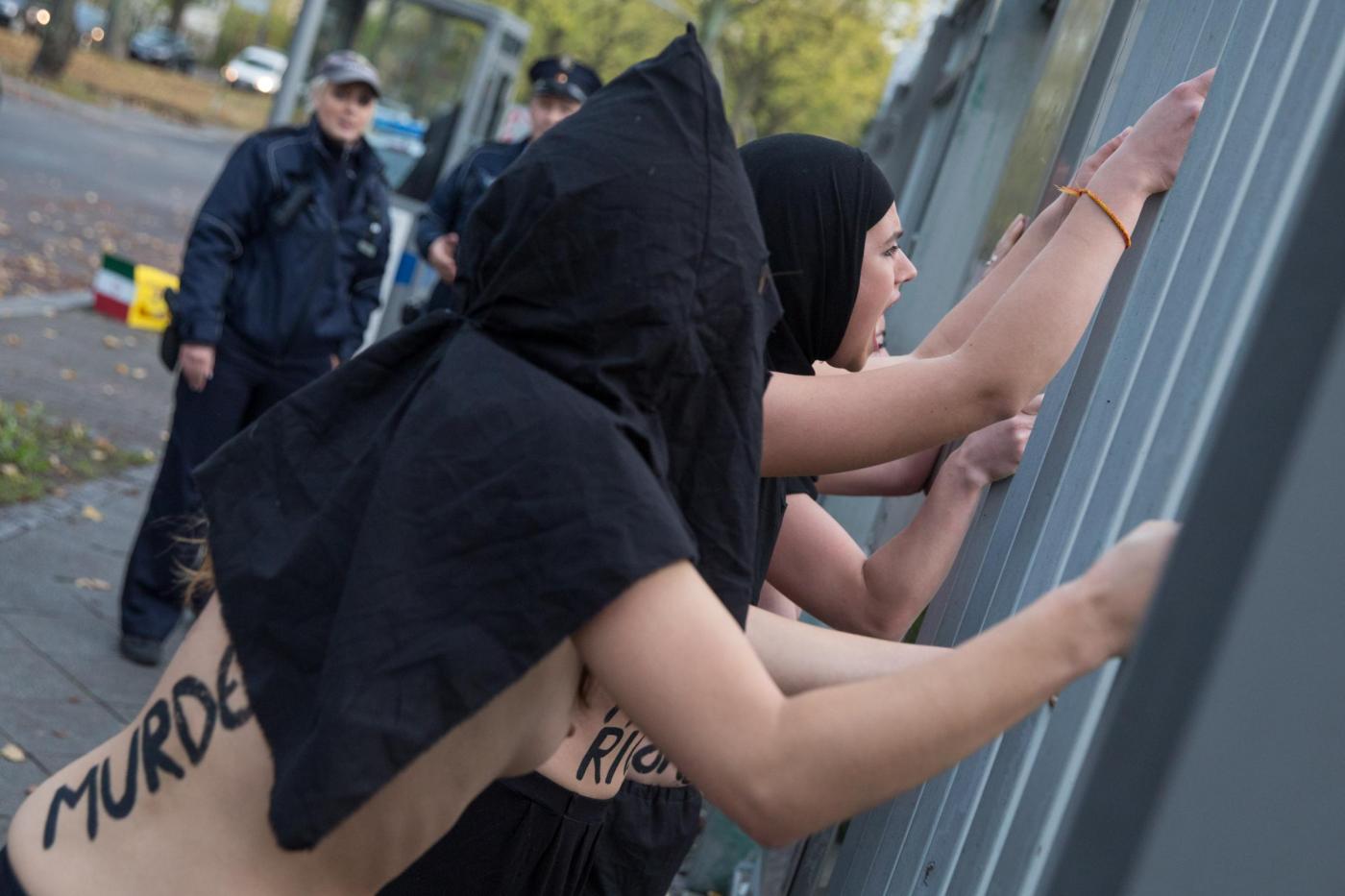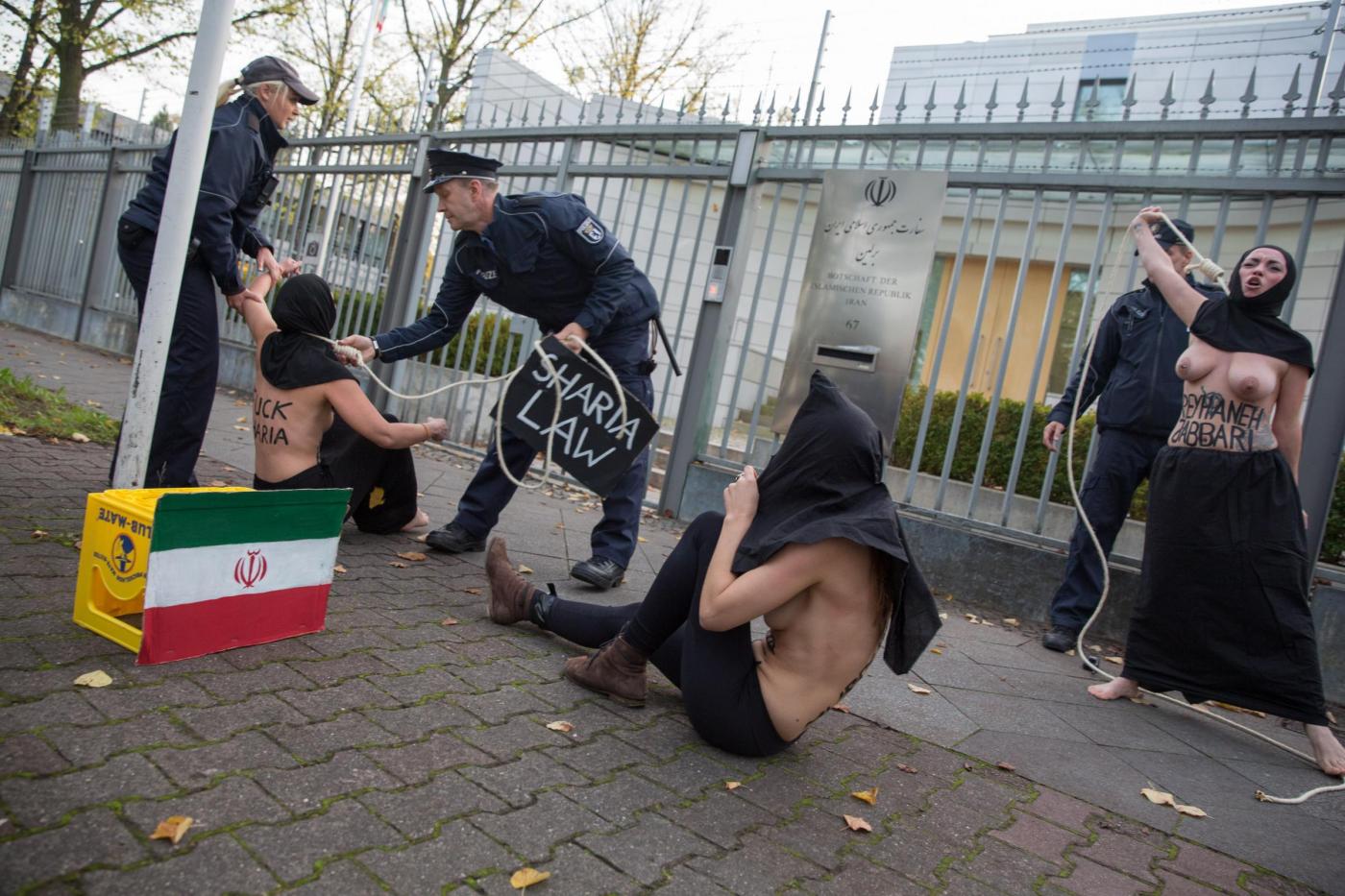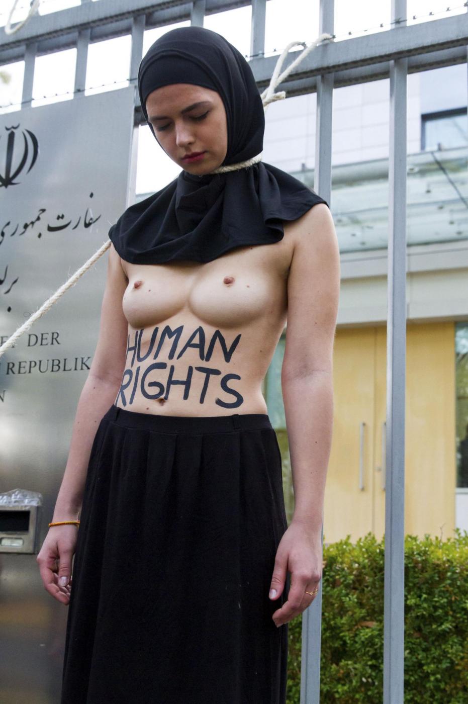 BERLINO – Alcune femministe appartenenti al gruppo delle Femen hanno protestato a seno nudo davanti all’ambasciata dell’Iran di Berlino subito dopo l’uccisione dell’iraniana Reyahneh Jabbari, morta attraverso l’impiccagione perché accusata di aver ucciso l’uomo che l’aveva stuprata.