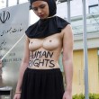 Le giovani hanno il volto coperto da un telo nero che ricorda quello che usa il boia; sul petto scritte contro la Sharia, a favore dei diritti umani e contro esponenti del governo iraniano. La polizia è intervenuta e ha portato via le ragazze con la forza (foto LaPresse)