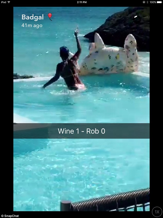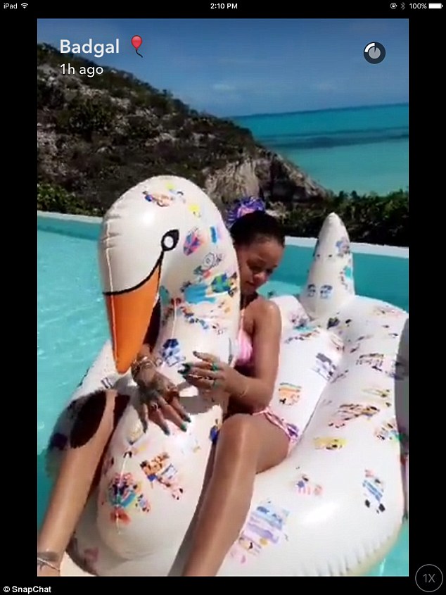 Poi, in altre foto pubblicate su SnapChat insieme ad un video, Rihanna che ha preso una pausa che durerà parte del mese di giugno prima di partire in tourneé per l’Europa, appare con un bikini rosa striminzito mentre si diverte giocando con una papera gigante in una piscina.