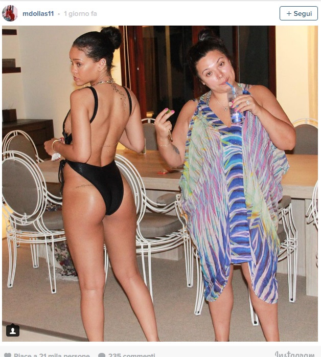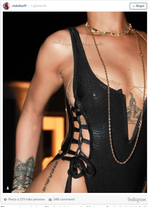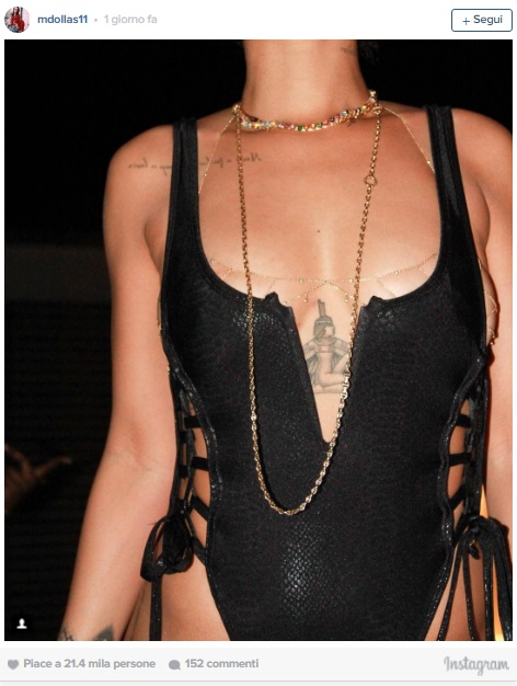 Rihanna indossa un costume nero Suga Apple Swimwear e lascia ben poco spazio all’immaginazione. Il costume mostra i suoi tanti tatuaggi e la sua forma strabiliante. La parte davanti, lascia ampiamente scoperto il seno coperto da una serie di collane d’oro e mostra il tatuaggio della Dea Iside.