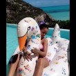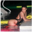 Poi, in altre foto pubblicate su SnapChat insieme ad un video, Rihanna che ha preso una pausa che durerà parte del mese di giugno prima di partire in tourneé per l’Europa, appare con un bikini rosa striminzito mentre si diverte giocando con una papera gigante in una piscina.