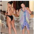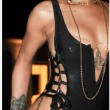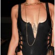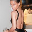 Rihanna indossa un costume nero Suga Apple Swimwear e lascia ben poco spazio all’immaginazione. Il costume mostra i suoi tanti tatuaggi e la sua forma strabiliante. La parte davanti, lascia ampiamente scoperto il seno coperto da una serie di collane d’oro e mostra il tatuaggio della Dea Iside.
