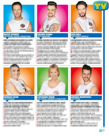 Dei concorrenti maschi cosa pensa? «Ci sono molti modelli; il grande pugile Oliva; Diaco, in tv, mi sembrava un gran rompipalle, invece è simpatico». Che altre paure ha per questa avventura? «Spero di non farmi male in qualche prova estrema: sarebbe dura andare avanti e voglio restare fino alla fine. All’Isola dovevo andare anche anni fa: avevo detto di sì a Simona Ventura, ma la Rai mi bloccò». Come si comporterà? «Sarò un gentleman. La mia natura è ironica. Si tratta di un gioco. La vera Isola la fanno quei padri in mezzo alla strada senza un lavoro che non possono mantenere i figli». Cosa porterà con sé? «Un telo anti-umidità per la notte: putroppo da mio padre ho ereditato l’artrosi. E una foto di mia madre che non c’è più: non me ne separo mai dal15 marzo del 1991, la guardo e riesco a capire se è contenta o meno». In molti si chiedono cosa indosserà, più che altro per non «umilare» gli altri concorrenti. «Uno slip aderente. Uguale per tutti. Per me è terrificante, al minimo contatto femminile, non so cosa potrebbe succederà».