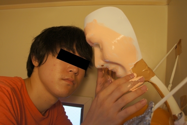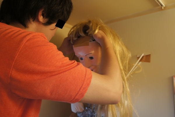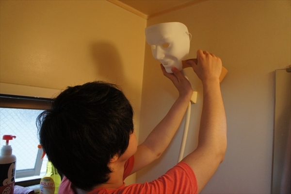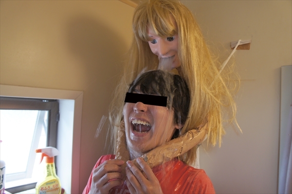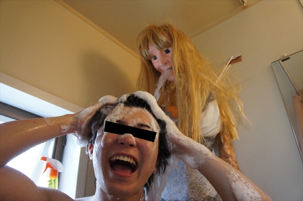 Prima il selfie, anche se non è un selfie poi una foto della triste doccia versione doccia semplice quindi i preparativi, la maschera, il vestito, i palloncini per dare il giusto rigonfiamento e infine le braccia e il caldo abbraccio-sputante.