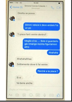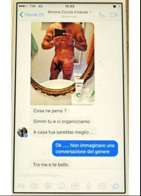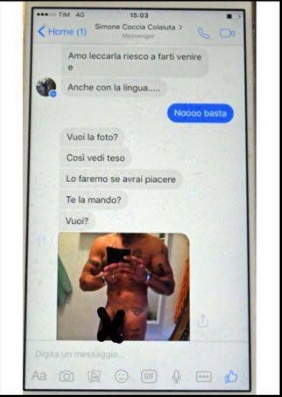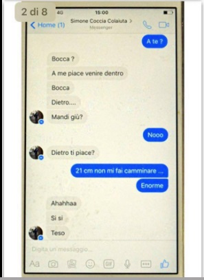 L’account ha pubblicato cinque screen di una conversazione che si sarebbe consumata su Facebook tra il fidanzato della senatrice ed una ragazza presumibilmente rumena. La conversazione è difficilmente riportabile: Coccia invita la ragazza ad organizzare un incontro sessuale (“a casa tua sarebbe meglio”) e racconta di essere super dotato (21 centimetri…) aggiungendo alla ragazza le due preferenze erotiche. Il tutto è accompagnato da una foto scattata in bagno, in cui Simone appare senza veli. L’autenticità della foto sarebbe confermata dagli innumerevoli tatuaggi che Simone Coccia Colaiuta ha sul corpo.