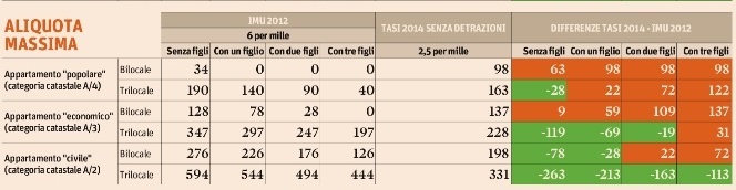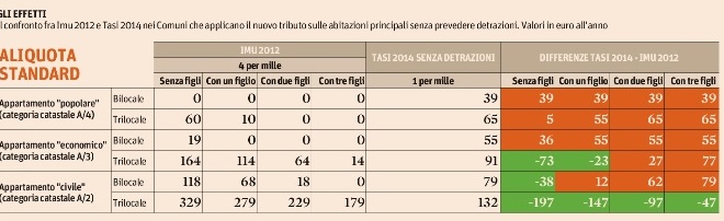 Secondo l’ultimo censimento condotto dall’agenzia del Territorio, il 51,2% delle abitazioni ha una rendita catastale fino a 400 euro, e di conseguenza aveva un’Imu azzerata o quasi dalle detrazioni e rischia di vedersi recapitare una Tasi più pesante della vecchia imposta. Completamente al sicuro da rincari sono solo le case in cui la Tasi ad aliquota massima e senza detrazioni risulta comunque inferiore all’Imu standard, ma questa condizione si ottiene solo con una rendita da 875 euro: una rendita raggiunta solo dal 10% delle case italiane. Nel 2012, infatti, più di metà dell’Imu è stata pagata dal 10% delle case più “ricche” (secondo il Catasto), mentre nella Tasi si profila una drastica redistribuzione verso il basso del carico fiscale. (Gianni Trovati, Sole 24 Ore)