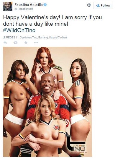 ROMA – Faustino Asprilla, l’ex stella della Colombia, ha voluto celebrare San Valentino in modo speciale. Confermando la sua fama di playboy Asprilla ha postato sul suo profilo Twitter una foto che lo ritrae insieme a quattro bellissime ragazze. “Buon San Valentino. Mi dispiace se non potete avere una giornata come la mia”, il messaggio dell’ex Parma.