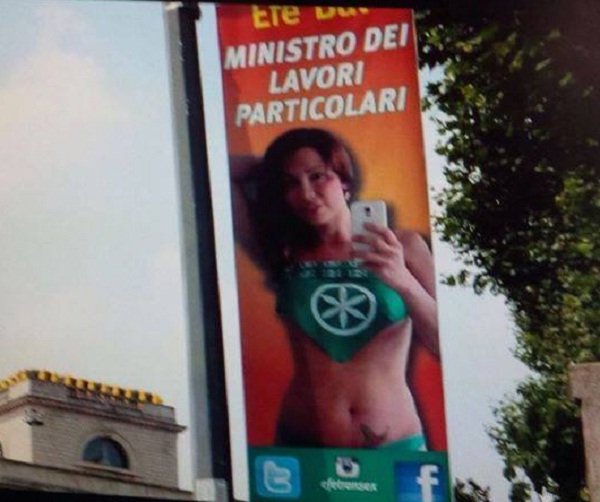 Si tratterebbe di una campagna pubblicitaria a livello personale di Efe Bal che un paio di mesi fa era presente ad una iniziativa della Lega Nord per tentare di abrogare la legge Merlin con Matteo Salvini. Polledri ha chiesto ‘un intervento legale del Carroccio per far ritirare i cartelli perché offensivi. “Tra le braccia ideali di Efe Bal – ha aggiunto – lasciamo radicali e sinistra”.