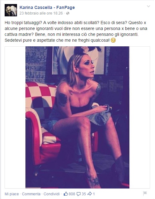 “Ho troppi tatuaggi? A volte indosso abiti scollati? Esco di sera? Questo x alcune persone ignoranti vuol dire non essere una persona x bene o una cattiva madre? Bene, non mi interessa ciò che pensano gli ignoranti. Sedetevi pure e aspettate che me ne freghi qualcosa?”.