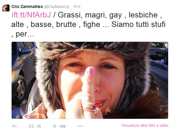 ROMA – “Clio make up non la conosco, ma è una cicciona“. Questa l’infelice uscita del regista Giovanni Veronesi, ospite di un programma radiofonico in onda su Radio 2. Il regista, che non conosce la celebre blogger e esperta di make-up che fa impazzire YouTube e i social media, ha apostrofato Clio come “una cicciona”. La replica di Clio, a ragione stizzita, non è mancata: “Forse sarò anche una cicciona, ma di certo non sono una stronza“.