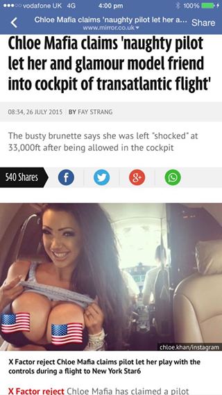 LONDRA – Chloe Khan, altrimenti nota come Ms Mafia, in cabina di pilotaggio con una amica. Peccato che tutto ciò sia successo durante il volo di linea, ed è stato tutto messo nero su bianco sui social network: un video su YouTube e varie foto su Instagram di Chloe, che è una ex modella porno nonché una ex concorrente di X-Factor Uk.