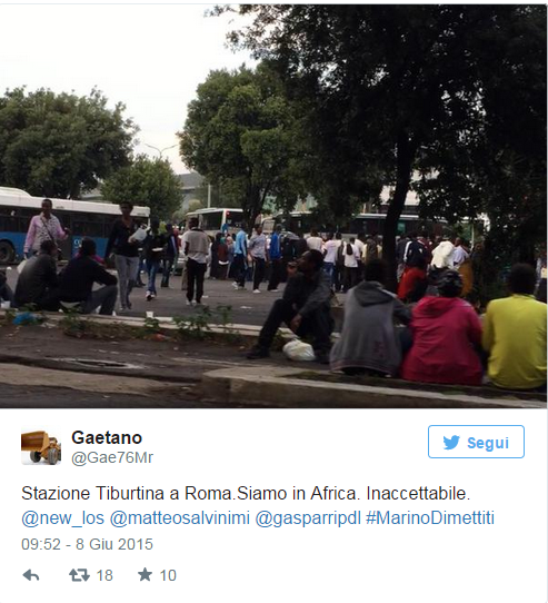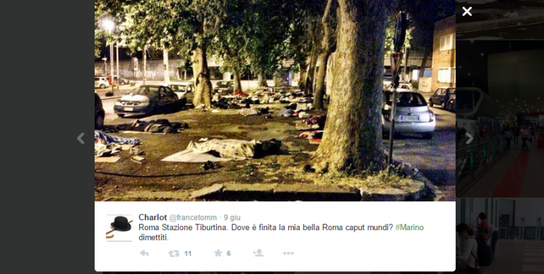 “Una moltitudine di persone dorme tra spazzatura e uccellacci nel parcheggio di Largo Mazzoni, tutt’intorno al terminal dei bus alla Stazione Tiburtina. A quanto pare sono eritrei o somali, persone che scappano da guerre e fame. Hanno preso possesso, nella più totale disorganizzazione del nostro sistema di accoglienza, di marciapiedi disastrati e pezzi di parcheggio. Dormono in terra sopra qualche straccio. Da giorni. E da giorni non ne parla nessuno. Una scena incredibile, l’ennesima. Guardate la foto notturna: sono cose che metterebbero in imbarazzo qualunque capitale europea. (…) Largo Mazzoni fa, di base, talmente schifo che pure se ci si installa un campo profughi, con tutte le conseguenze anche sanitarie che questo può determinare, nessuno se ne cura più di tanto. Situazioni che regalano a partiti come quello di Matteo Salvini decine e decine di migliaia di consensi. Che logica ha tutto questo?”
