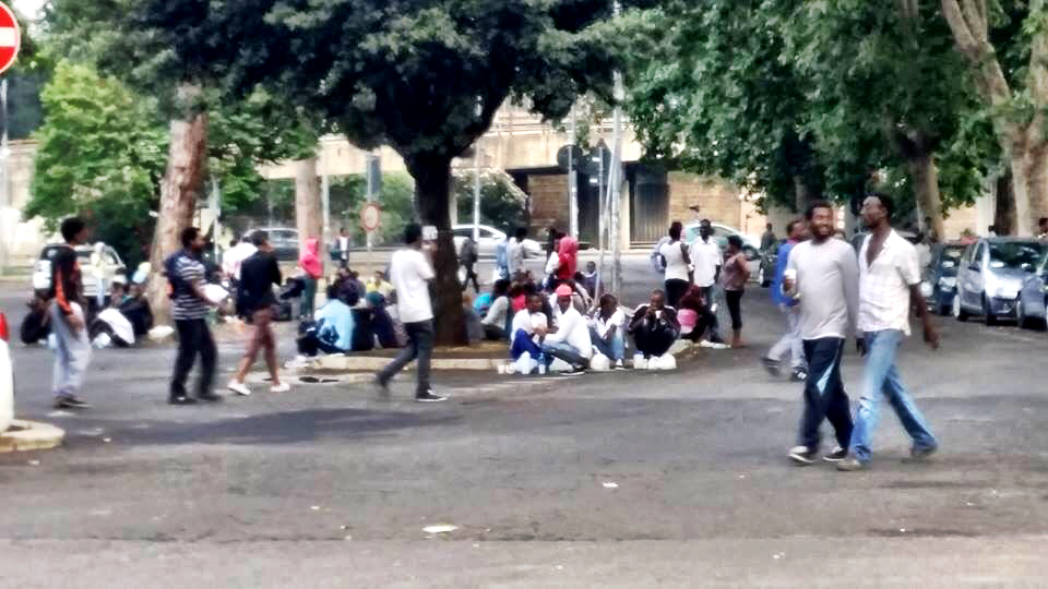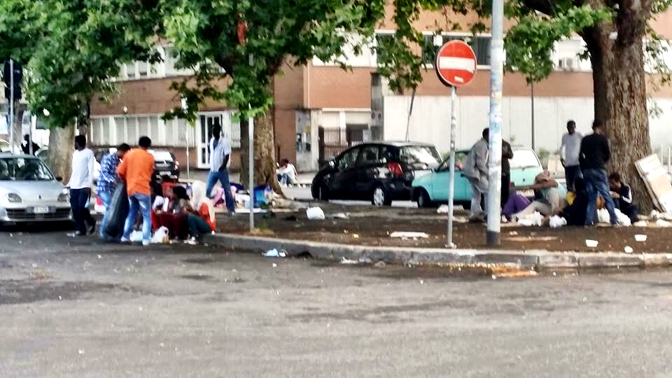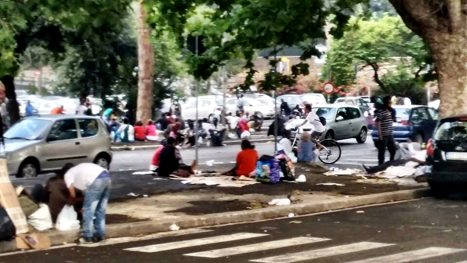 “I fotogrammi di una giornata a Largo Mazzoni e in via Pietro l’Eremita sono tremendi. Raccontano di una baraccopoli improvvisata, dei bisogni fatti in strada, di rifugiati che provano a lavarsi alle fontanelle. Iniziano a esserci anche problemi igienici con il caldo che attanaglia le giornate in strada di centinaia di profughi. Tra loro ci sono anche alcuni degli immigrati che settimane fa sono stati sgomberati da via delle Messi d’Oro (zona Ponte Mammolo), sempre nello stesso municipio, il IV. Alcuni sono stati accolti in strutture di emergenza, altri sono ancora in strada e si sono uniti ai rifugiati che da giorni sono accampati a ridosso del parcheggio. In strada c’è la Croce Rossa a fare la sua parte. “Abbiamo inviato assistenza per i transitanti a Largo Mazzoni, so che anche le parrocchie della zona si stanno mobilitando per aiutarli, c’è bisogno di tutto: di assistenza sanitaria, di acqua e cibo, i nostri volontari si stanno già organizzando”.